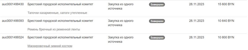 Брестский горисполком в ноябре и декабре закупил футболки защитного цвета, мужские трусы, казарменные тапочки, утепленные сапоги, брючные ремни и маскировочные зимние костюмы. Суммарно эти покупки обошлись в 51 040 рублей, а занимался ими главный специалист по государственным секретам Александр Золотухин.