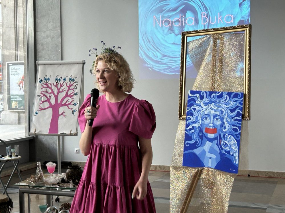 На адкрыцці выставы адбылася і прэзентацыя новай працы Надзі Букі – «Немагчыма маўчаць». Як распавяла жанчына, яна ўпершыню выкарыстала манахромныя сінія колеры. Гэтая карціна, як і астатнія працы Надзі, мае шмат сімвалізму: