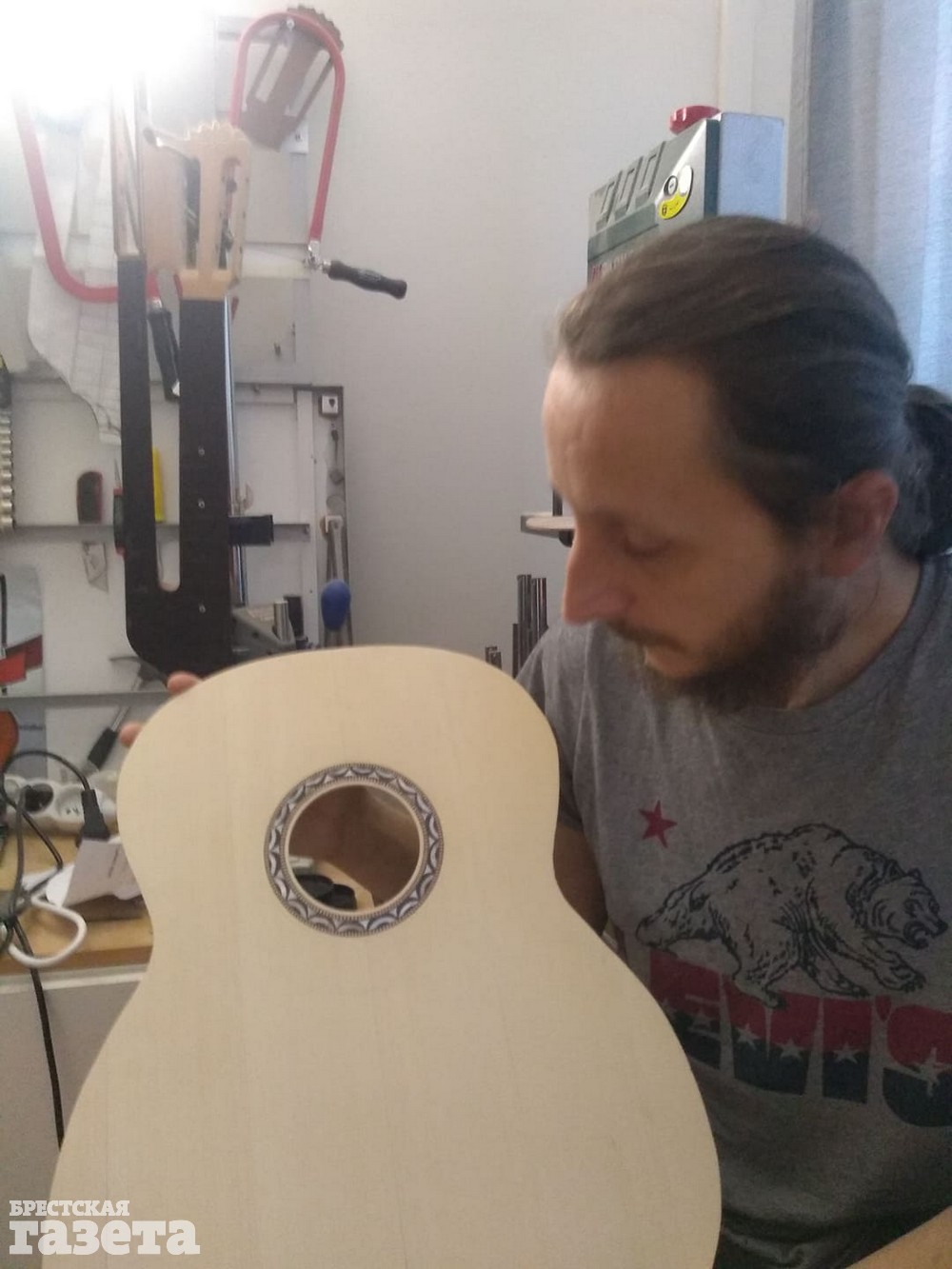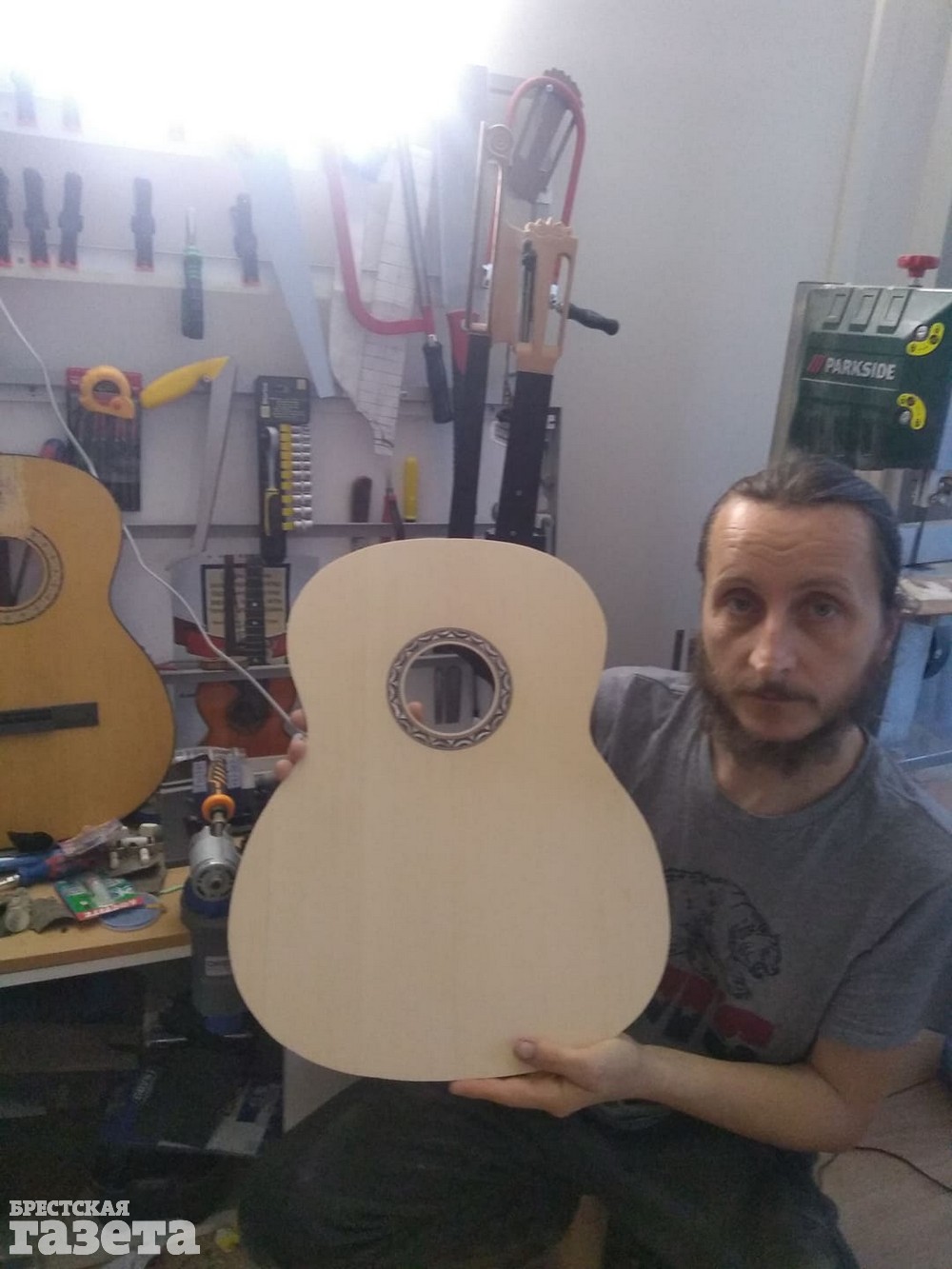 Мы з сям’ёй жывем у трохпакаёвай кватэры ў Празе. У нас вялікі зал, частку яго я абсталяваў пад майстэрню. Купіў дрэва, станкі, прылады, пілы, гэблікі, лакі. Раблю цяпер гітару на замову беларусаў, якія жывуць у Чэхіі. Ужо гатовы грыф і корпус, засталося склеіць, палакаваць.