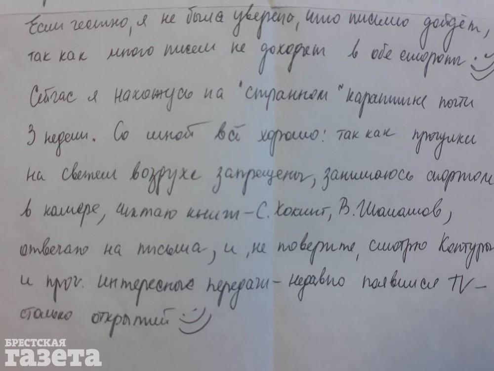 «Я получаю множество писем со всех уголков Беларуси и мира — это придает мне колоссальных сил и энергии, — пишет Мария — Если честно, я не была уверена, что письмо дойдет, так как много писем не доходят в обе стороны. Сейчас я нахожусь на «странном» карантине почти три недели. Со мной все хорошо: так как прогулки на свежем воздухе запрещены, занимаюсь спортом в камере, читаю книги, отвечаю на письма, и, не поверите, смотрю «Контуры» и прочие интересные передачи — недавно появился TV — столько открытий)».