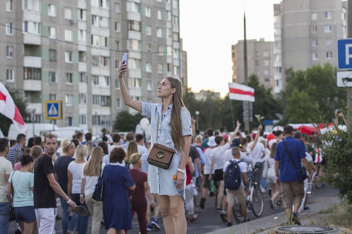 Люди, которые собрались перед заграждениями скандировали «Жыве Беларусь», «Верым, можам, пераможам». По другую сторону ограждения, помимо милиции, стояла малочисленная группа протестующих. Среди них — лидер группы «Дай Дарогу!» Юрий Стыльский, который вел стрим с места событий. Они пришли на площадь Ленина заранее, когда милиция еще не выставила турникеты, и расправили напротив облисполкома большой бело-красно-белый флаг.