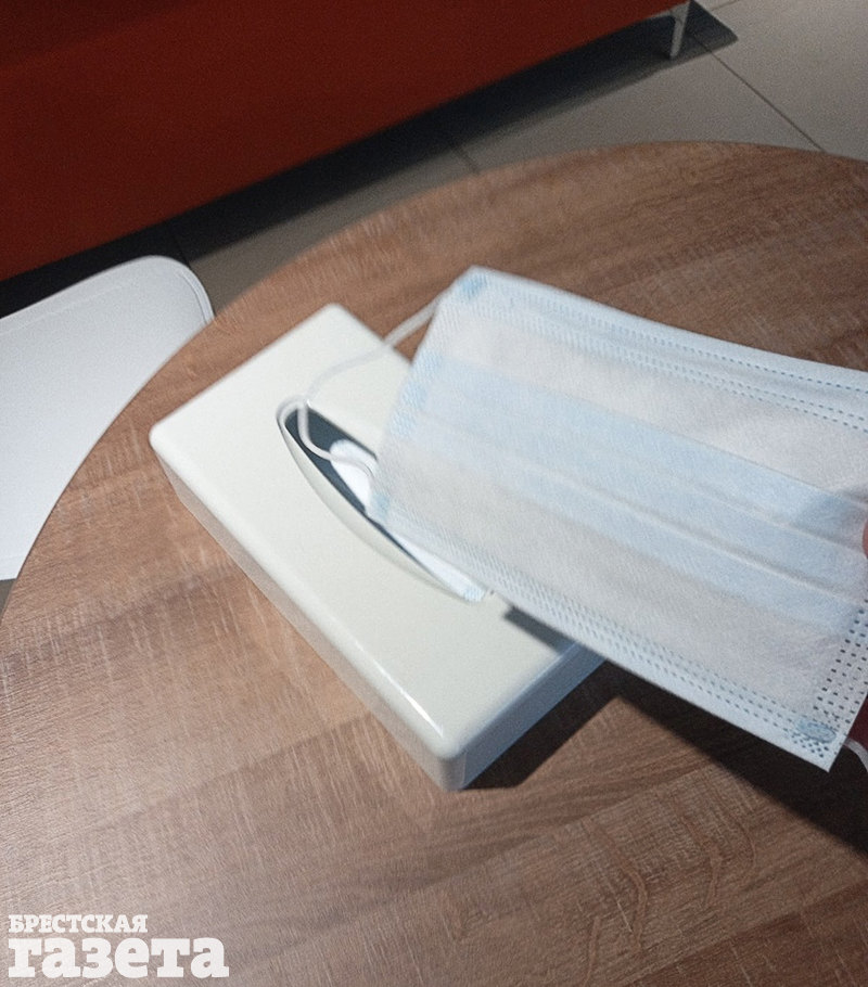 Упаковка с одноразовыми масками масками на столе брестского банка.
