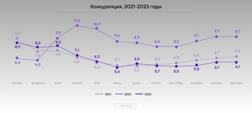 Средняя конкуренция по рынку труда по итогам 2023 года составила порядка 6,6 резюме на одну вакансию, тогда как по итогам 2022 года она находилась на уровне 9 резюме. Наибольшая конкуренция в ушедшем году была зафиксирована в самом его начале — в январе — 8,9 резюме на одну вакансию.