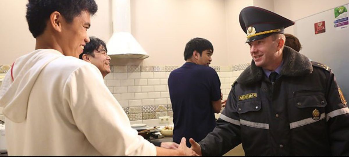 09.04.2025 05:47 Беларуский милиционер жмет руку трудовому мигранту. Источник фото