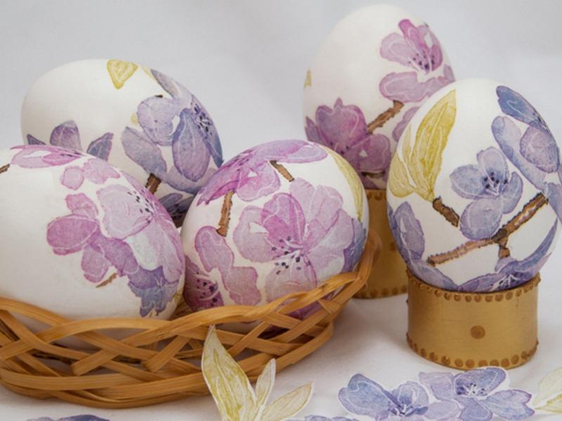 Сварите яйца вкрутую. Затем выберите бумажную салфетку, отделите верхний слой и вырежьте понравившийся фрагмент. Картинку плотно приложите к скорлупе, поверх рисунка нанесите кистью растворенный желатин или клейстер, приготовленный из кукурузного или картофельного крахмала. Главное – разгладьте все складочки и надежно зафиксируйте тончайшее бумажное полотно на скорлупе. Оставьте сушиться и декупажное яйцо готово.