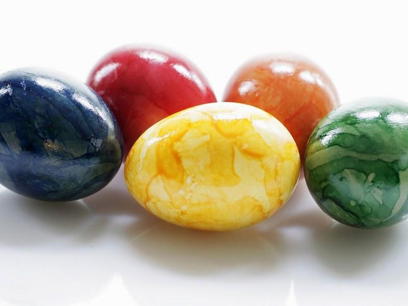 Еще способ: чтобы добиться мраморного эффекта, можно использовать краситель вместе с подсолнечным маслом. Для этого сначала покрасьте вареное яйцо в светлый тон и дайте ему полностью высохнуть. Добавьте в емкость с более темной краской ложку растительного масла и осторожно, не взбалтывая, перемешайте раствор. После этого большое масляное пятно должно разбиться на маленькие – размером с горошину. Высохшее яйцо окуните в раствор красителя с маслом и сразу же извлеките и смажьте растительным маслом для блеска.