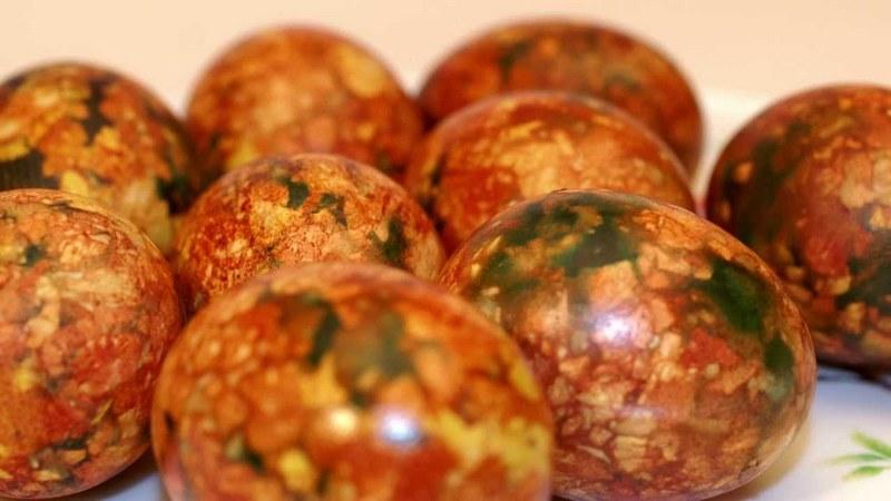 Как бы ни были необычны современные веяния, традиции никто не отменял. Мраморный способ окрашивания нельзя назвать сложным, но и он требует определенной сноровки. Понадобится луковая шелуха, марля и краситель. В качестве красителя можно использовать аптечную зеленку (1 пузырек).