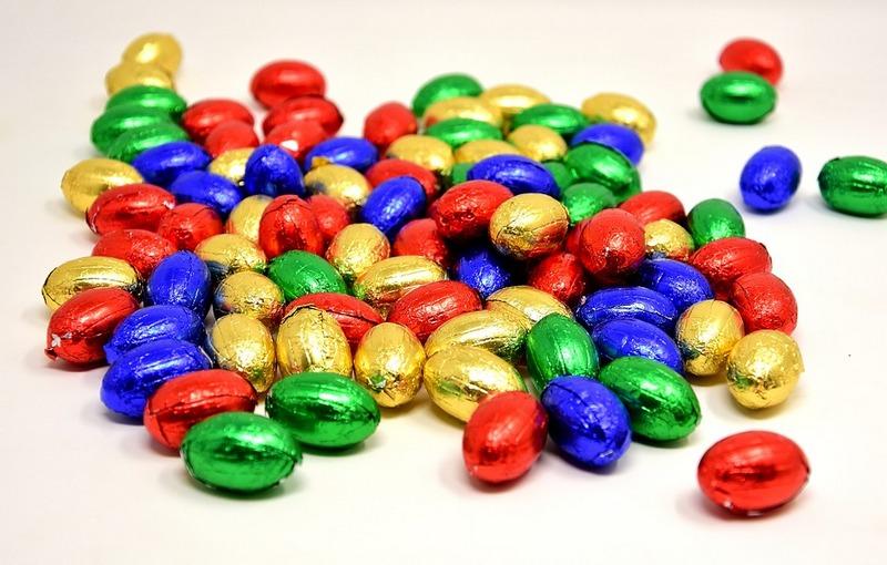 Отварите яйца. Разноцветную фольгу разрежьте на прямоугольные кусочки такой величины, чтобы ее хватило для оборачивания яйца. Подготовьте элементы декора или просто воспользуйтесь конфетти. Оберните остывшие яйца фольгой. Клеем можно прикрепить к ним декор.