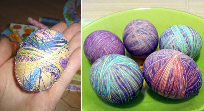 Намотайте на сырое, предварительно промытое яйцо (оно должно быть комнатной температуры) разноцветные нитки мулине. Комбинируйте цвета и расположение ниток так, как подскажет фантазия. Затем отварите их вкрутую обычным способом и снимите нити.