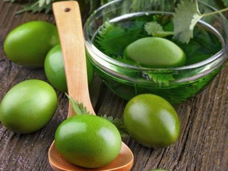 Для окрашивания яиц в зеленый цвет залейте их горячим отваром крапивы либо петрушки. Затем добавьте столовую ложку уксуса и варите полчаса. Чтобы цвет получился насыщенным, поле варки яиц подержите их в отваре час-полтора.