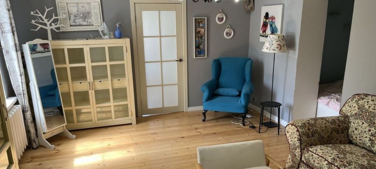 В квартире есть большая просторная кухня с выделенной столовой зоной и камином. А также гардеробная комната, переделанная хозяевами в мини-спальню. Квартира оформлена в милом стиле «прованс» с акцентом на экологичность. Вся мебель в комнатах сделана из массива ясеня, а полы выполнены из сосновой доски. На окнах стоят деревянные стеклопакеты, а межкомнатные двери — из массива сосны. Отдельного внимания заслуживают милые аксессуары и цветочный принт, начиная с занавесок и заканчивая диванами.