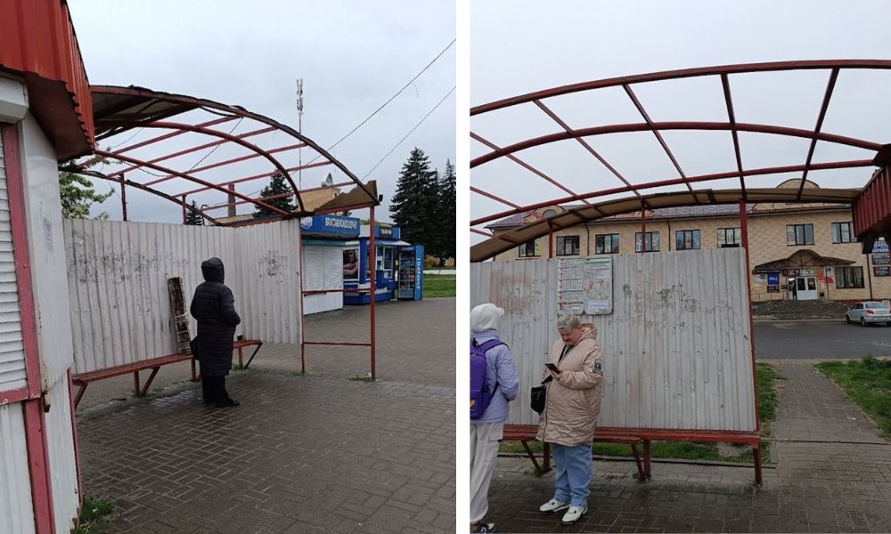 Пост с фотографиями автобусной остановки «Комбинат хлебопродуктов» в Пинске появился в социальной сети «ВКонтакте» 22 апреля. На снимках видно, что на конструкции нет навеса.