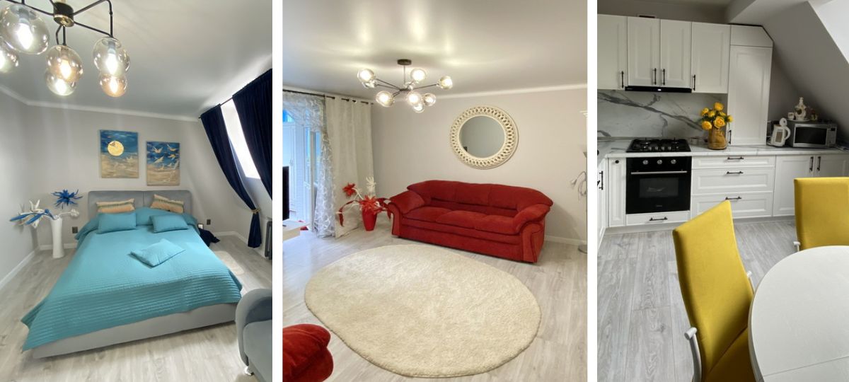 В квартире очень интересный дизайн. На фоне светлых стен и потолка в качестве акцентов выступает яркая мебель. Например, в гостиной — это красный диван и кресло, в кухне — желтые стулья, а в спальне — голубые покрывала и подушки на серых кровати и диване.