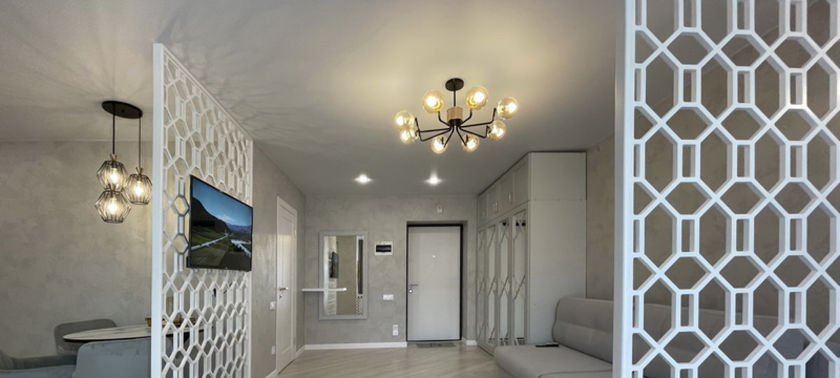 В квартире по сути одна большая комната, разделенная перегородками на кухонную, спальную и гостиную зоны. На входе есть большой вместительный шкаф и зеркало. В гостиной части — просторный диван и телевизор на стене. В кухне — обеденная зона. Спальня также отделена перегородкой. Серый тон стен и мебели, белые резные панели, разноплановая система освещения, лампы, фурнитура на дверях и в кухонном гарнитуре выглядят стильно и ненавязчиво.