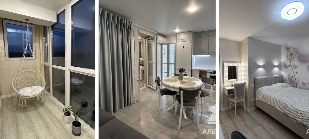 Большим плюсом рассматриваемой «трешки» можно считать две просторные застекленные лоджии. На одну выход есть из кухни, на вторую — из комнаты с гримерным зеркалом. Кстати, посмотрите на ее оформление. Подвесное кресло очень располагает к приятному времяпровождению, как в теплое, так и в холодное время года — лоджии утеплены.