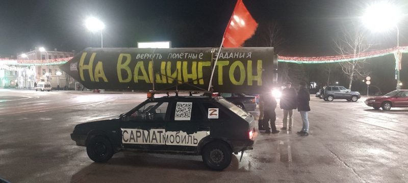 Первым «сармат-мобиль» обнаружило гомельское издание «Флагшток». На машине большие наклейки Z, на крыше — макет ракеты с надписью «Вернуть полетные задания на Вашингтон». Издание пишет, что хозяин автомобиля — активист прокремлевской организации НОД Равиль Гарифуллин. Он из российского Татарстана. Мужчина спокойно передвигался по Гомелю, оставлял машину на площадях, но ГАИ этот автомобиль не замечает.