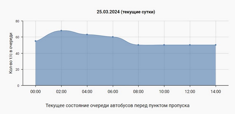 Напряженная ситуация и с автобусами. На 14.00 выезда в Польшу ожидают 50 автобусов. Очередь немного уменьшилась: в 2.00 было 68 автобусов, а в 6.00 — 60. Ждать в такой очереди приходится около суток.