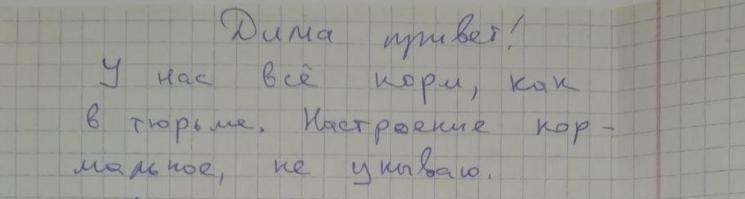 Единственный способ связи с Кабановым и Петрухиным сейчас – письма и открытки. Активист Дмитрий Андросюк по просьбе «БГ» показал письма, которые получил в ответ на свои открытки. Письмо Петрухина совсем короткое, у Кабанова немного длиннее. Оба пишут, что у них все нормально, насколько это может быть в сложившейся ситуации.