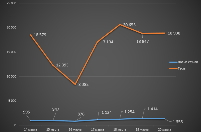 Что касается количества выполненных тестов, то за последние семь дней их число составило 114 898 (на предыдущей неделе – 93 169), а официальная смертность поднялась на 3: неделей ранее было 58 летальных исхода, с 14 по 20 марта – 61.