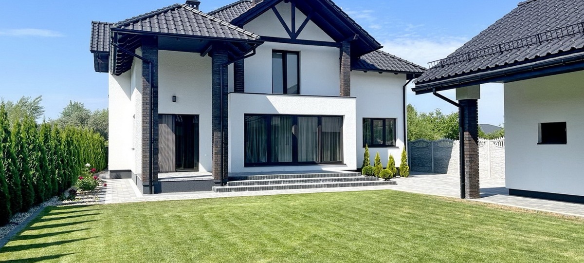 Современный дом расположен в Гершонах, в живописном месте среди озер. Его площадь — 269,2 кв. м. Как пишут в объявлении, он отличается современным дизайном и продуманным зонированием и планировкой. Ахроматический цвет вкупе с черными акцентами делают его контрастным и выделяющимся на фоне остальных домов.