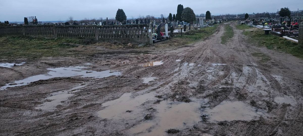 На въезде со стороны Молодечно видна размокшая дорога, которую водители уже объезжают, не щадя посевы. Со стороны самого агрогородка ситуация еще хуже: огромная лужа протяженностью в несколько метров заставляет машины маневрировать буквально по краю могил. На некоторых захоронениях уже повреждено ограждение.